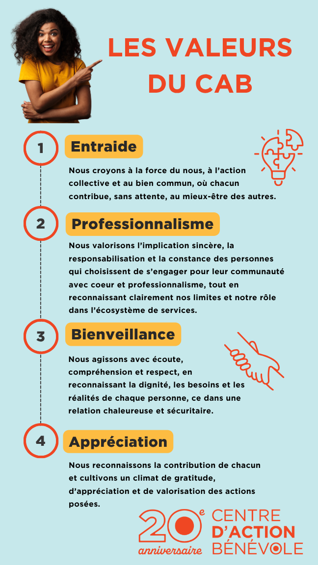 Le Centre d'action bénévole du grand Châteauguay a comme mission de promouvoir l'action bénévole dans les différents champs de l'activité humaine et de répondre aux besoins du milieu par l'action bénévole.