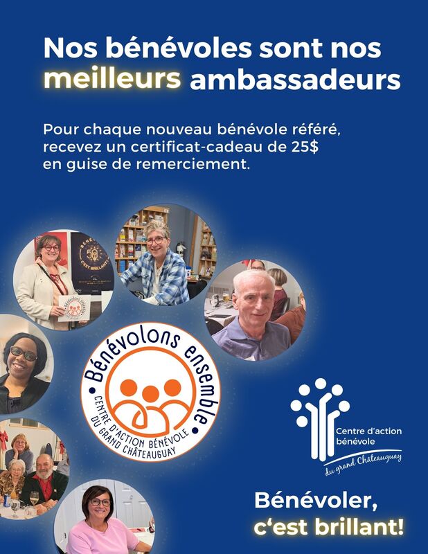 • Pour chaque nouveau bénévole référé, recevez un certificat-cadeau de 25$ en guise de remerciement.